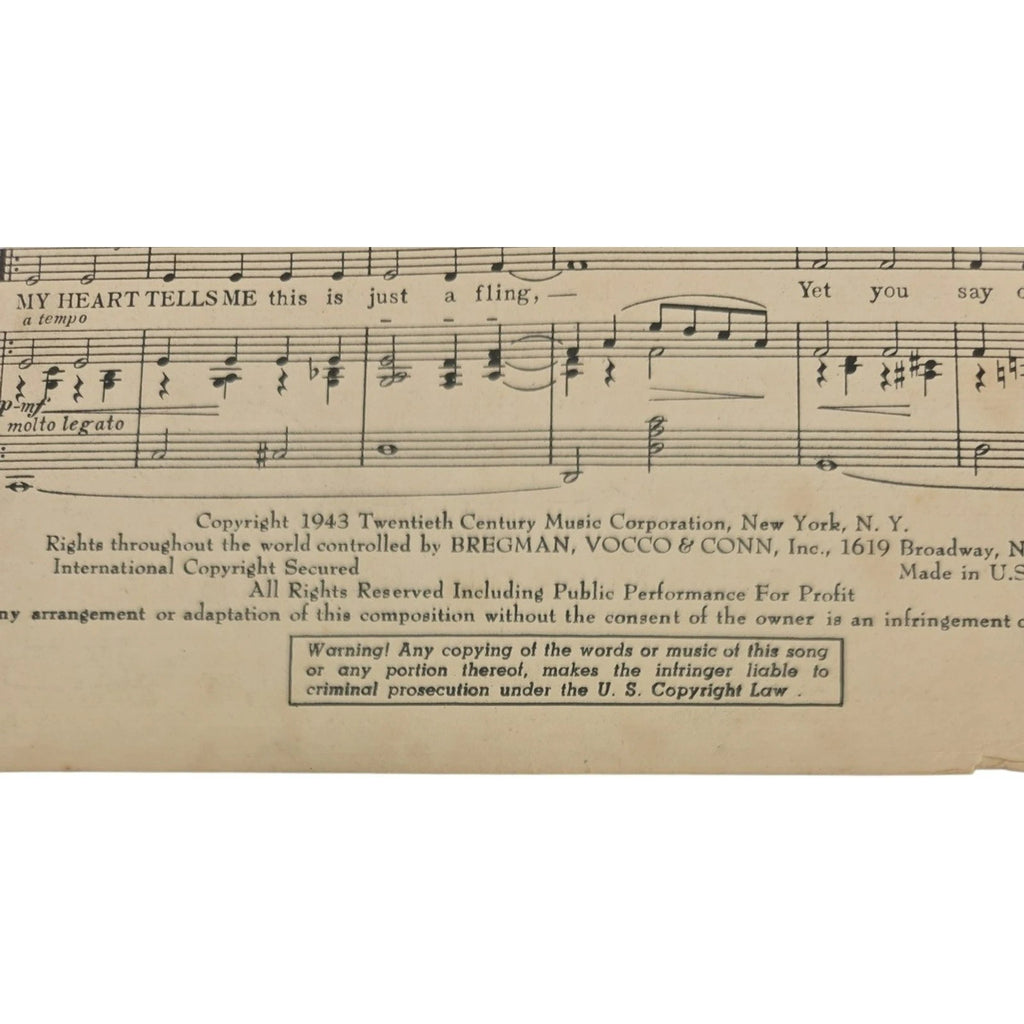The product is a vintage 1943 sheet music for the song "My Heart Tells Me" by Mack Gordon and Harry Warren. This sheet music, suitable for piano, falls within the genre of Musicals and was published by Bregman Vocco & Conn Inc. in the United States. With an intermediate experience level, this unit quantity of 1 piece of sheet music allows musicians to play a classic piece from the mid-20th century.