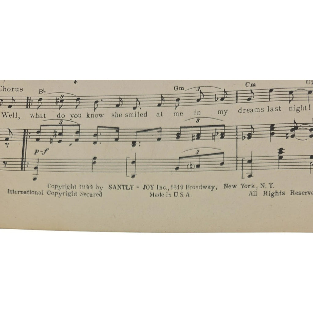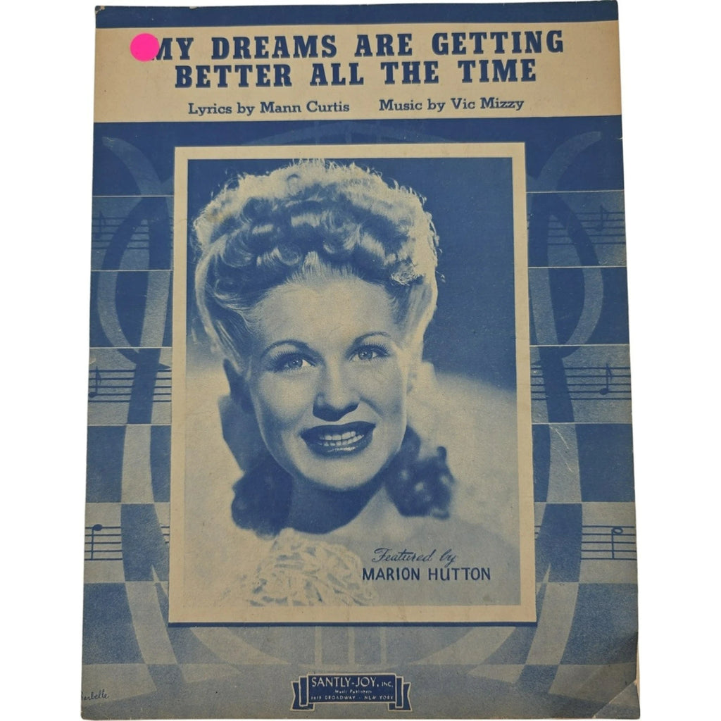 The product is a vintage sheet music from 1944 titled "My Dreams are Getting Better all the Time" sung by Marion Hutton. This sheet music is in piano format and falls under the genre of Easy Listening and Musicals. Published by Santly Joy in the United States, it is designed for intermediate level musicians looking to play solo. With a unit quantity of 1, this sheet music is a nostalgic piece that captures the essence of classic American music from the mid-20th century.
