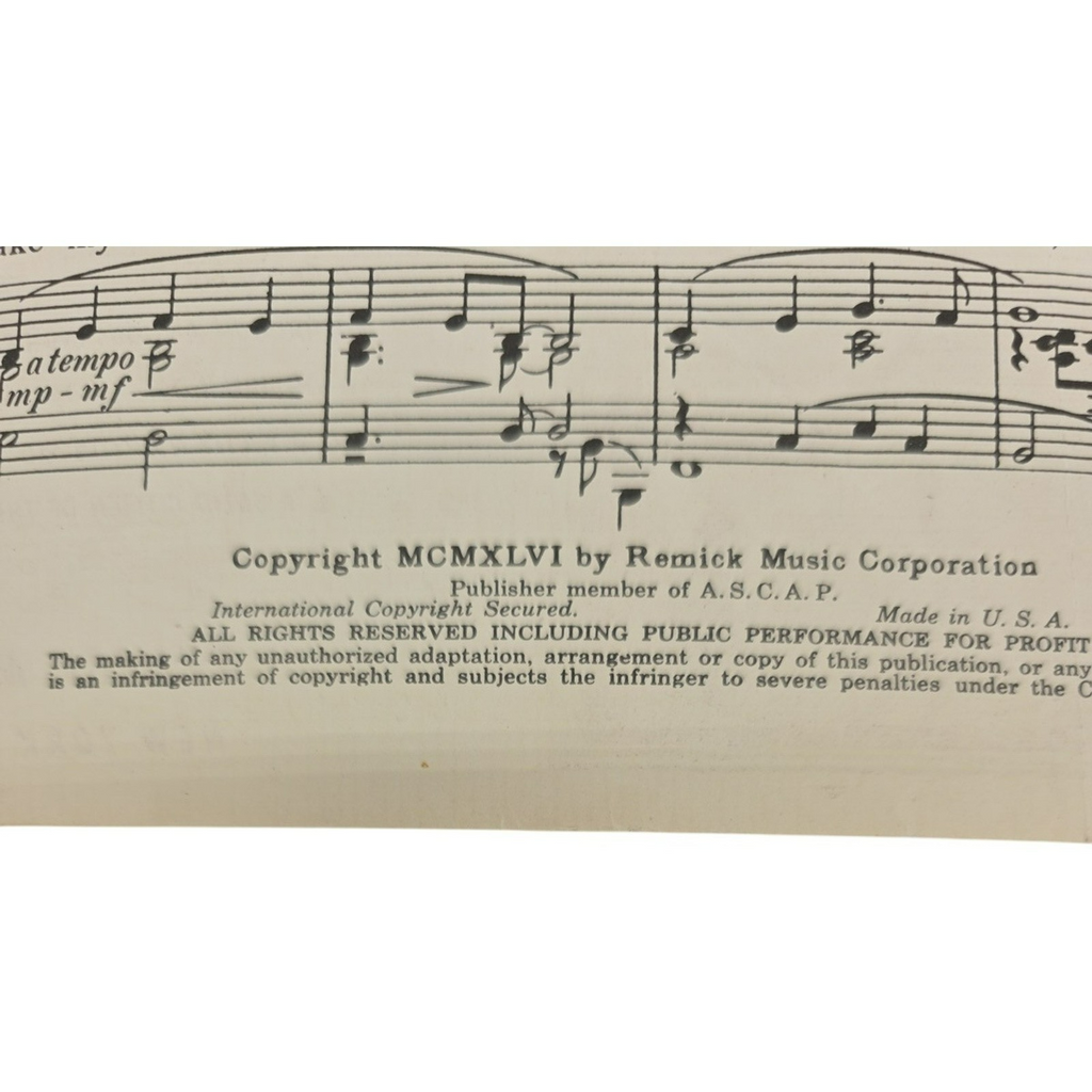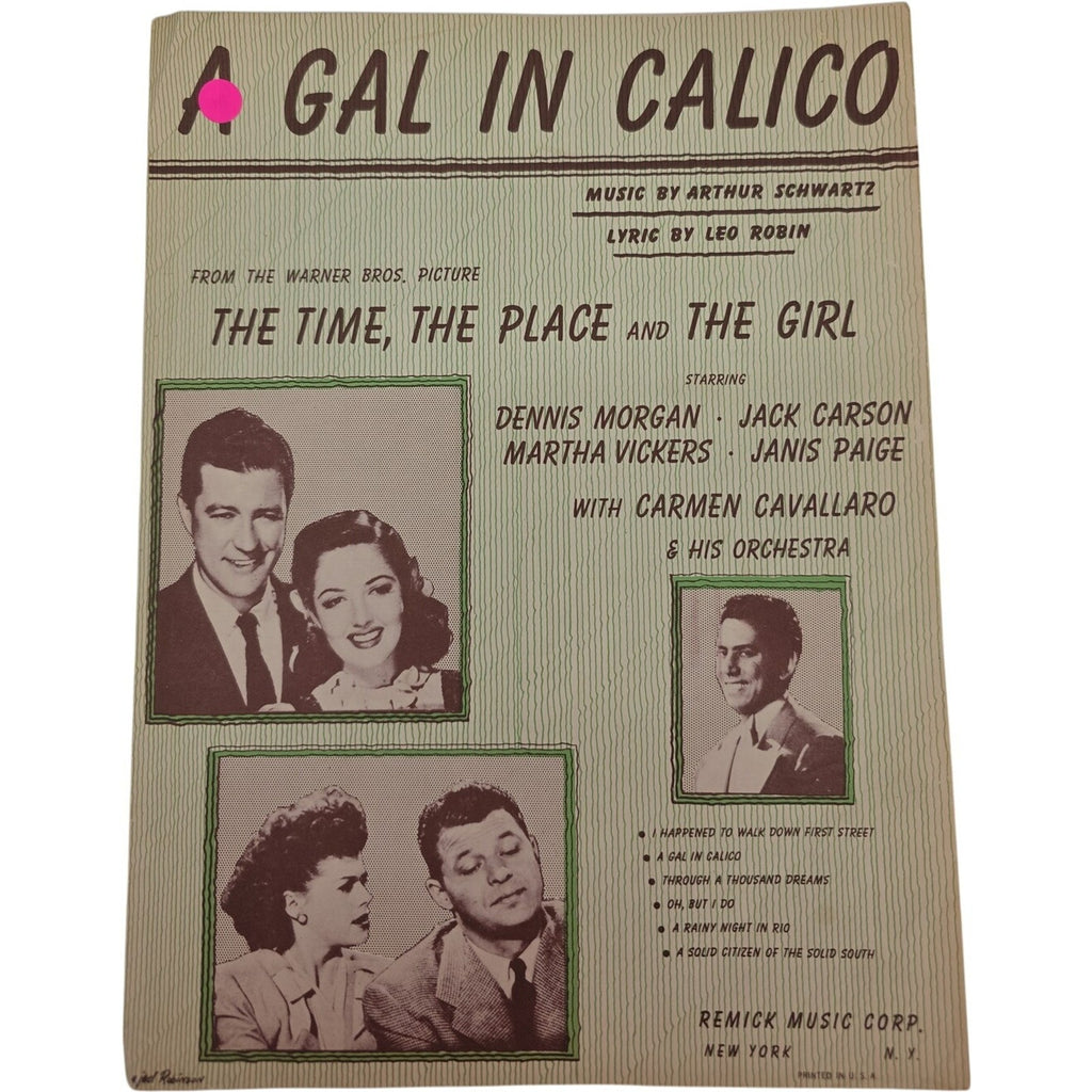 This vintage sheet music from 1946 features the song "A Gal In Calico" performed by Dennis Morgan and Jack Carson. It is designed for piano players with an intermediate experience level and falls under the genre of Musicals. The sheet music was made in the United States and consists of one unit. Perfect for collectors or enthusiasts of vintage musical instruments and gear, this piece of nostalgia captures a classic piece of musical history.