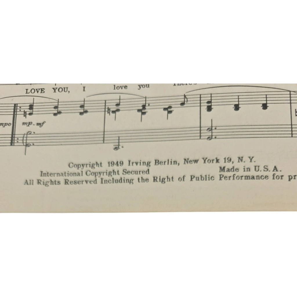 This product is a vintage 1949 sheet music titled "Just One Way to Say I Love You" from the musical "Miss Liberty." Published by Irving Berlin Music Corp. in the United States, it is designed for intermediate level piano players. As a piece of musical history, this sheet music allows musicians to play a classic song from a well-known musical in its original form. It is a unique and nostalgic addition to any musician's collection, especially for those who enjoy playing musicals.