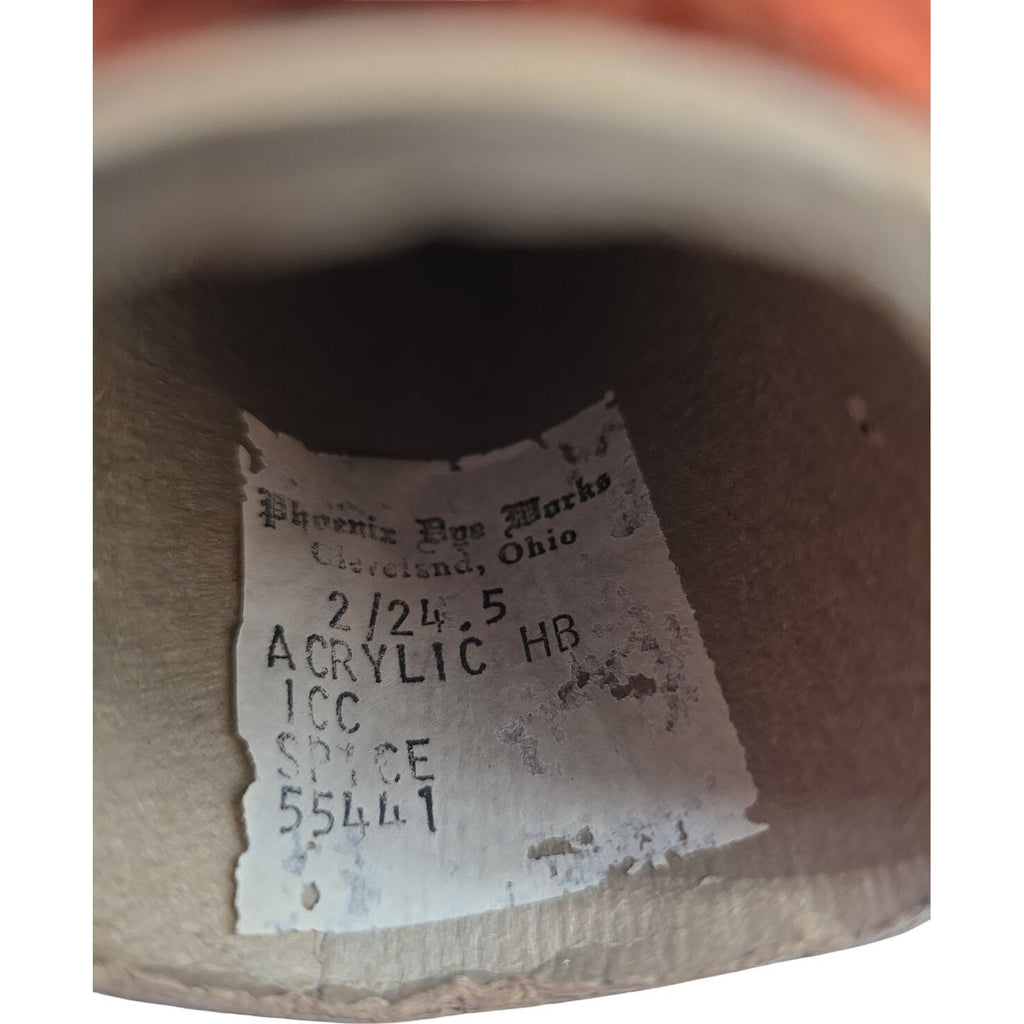 The Vintage 1980s Phoenix Dye Works 2/24 Acrylic Yarn Cone in Spice color is a unique and stylish addition to any crafting project. Made in the United States, this yarn cone is crafted from acrylic fiber, making it versatile and easy to work with for a variety of crafts. With its vintage style and specific model number (55441), this yarn cone offers a touch of nostalgia and quality craftsmanship for your creative endeavors.