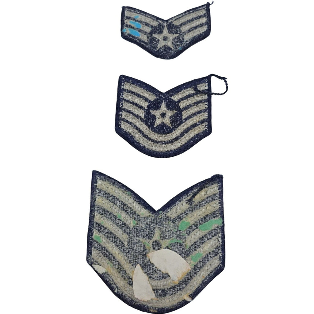This lot includes three vintage circa 1980 US Air Force rank insignia patches, measuring 3 and 4 inches. Each patch represents a piece of military history and is a collectible item that would appeal to those interested in militaria. Made in the United States, these patches showcase the insignia used by the Air Force during that time period, making them a unique and nostalgic artifact for collectors or enthusiasts of military memorabilia.