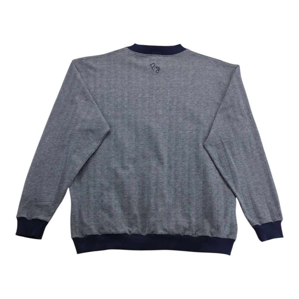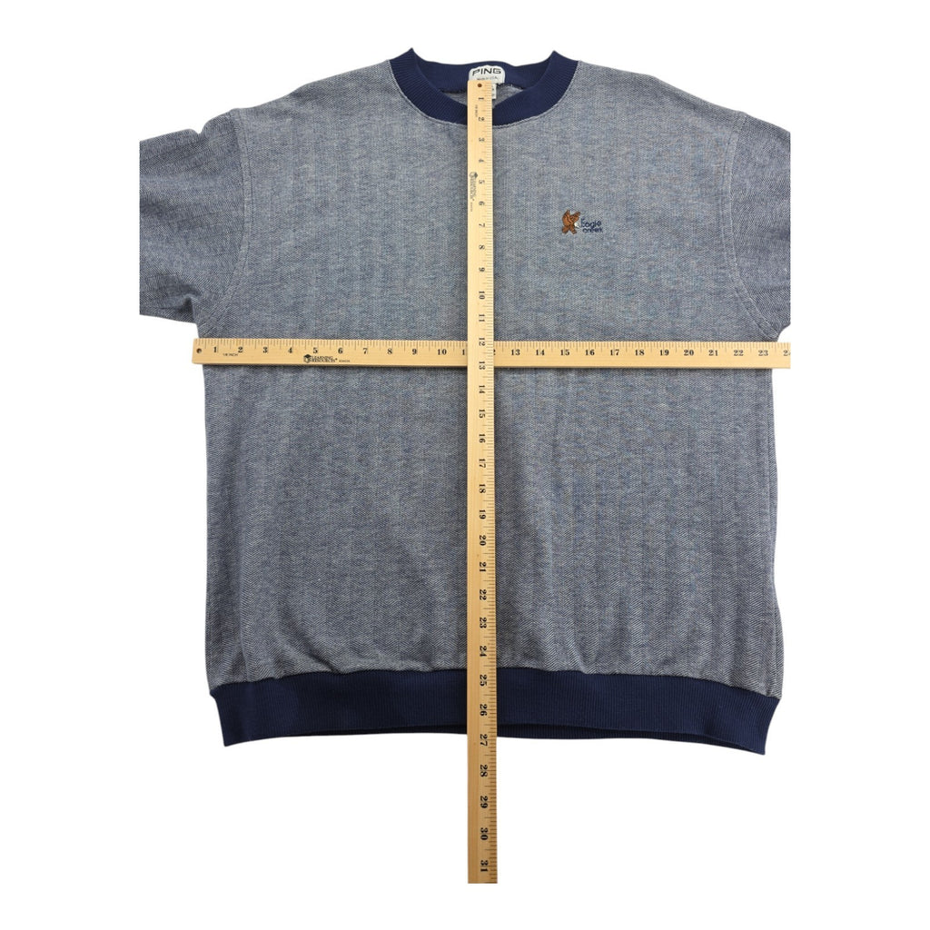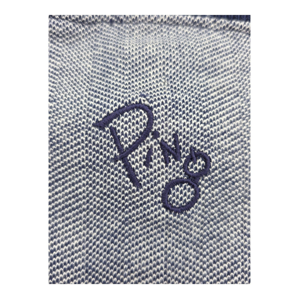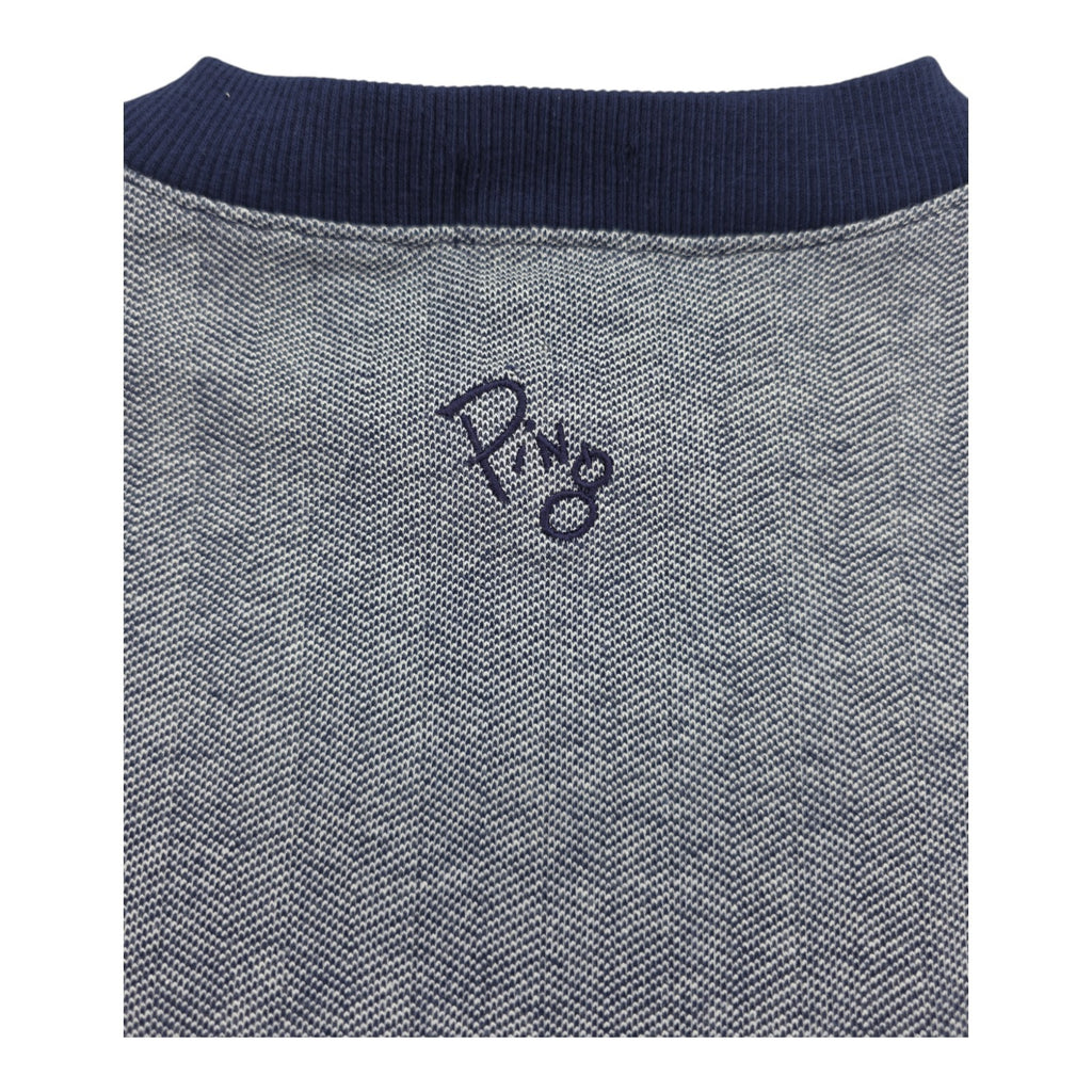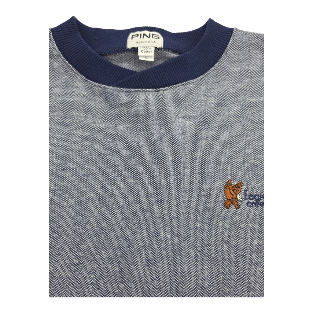 The Vintage PING Sweatshirt is a classic pullover style sweatshirt in heather gray with navy trim, featuring the iconic PING logo embroidered on the front. Made of cotton knit fabric and machine washable, this men's sweatshirt is perfect for any season and has a regular fit. With its 90s retro design and sports theme, this sweatshirt is a stylish and comfortable addition to any wardrobe. Made in the USA, this vintage piece is a unique and nostalgic find for any fan of classic American clothing.