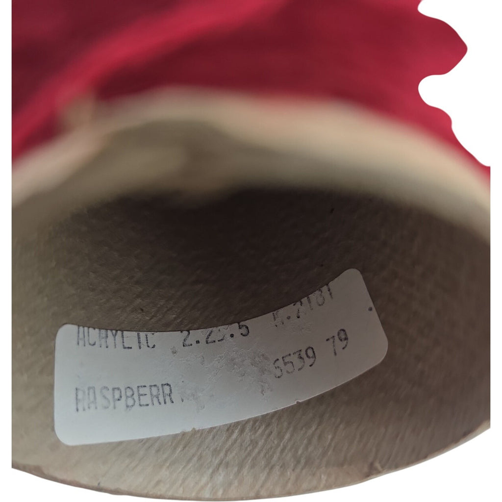The product is a vintage raspberry red acrylic cone yarn, perfect for weaving, knitting, and crochet projects. This unique yarn offers a retro style and vibrant color, making it a desirable choice for crafters looking to add a vintage touch to their creations. With its high-quality acrylic fiber content, this yarn is sure to provide a soft and durable texture for a variety of projects.