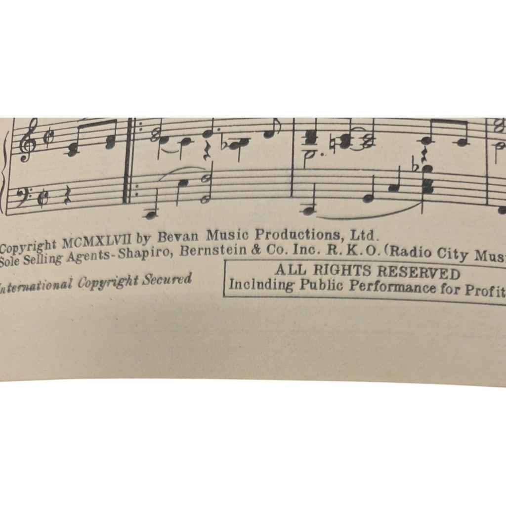 This vintage sheet music from 1947 features the hit song "A Tree In The Meadow" by composer Billy Reid, performed by Sammy Kaye. The format of the sheet music is ideal for pianists and vocalists looking to play or sing the tune in the genres of Easy Listening, Jazz, and Musicals. Published by Shapiro, Bernstein, & Co., Campbell - Connelly in the United States, this advanced level piece offers musicians a nostalgic and classic addition to their repertoire.