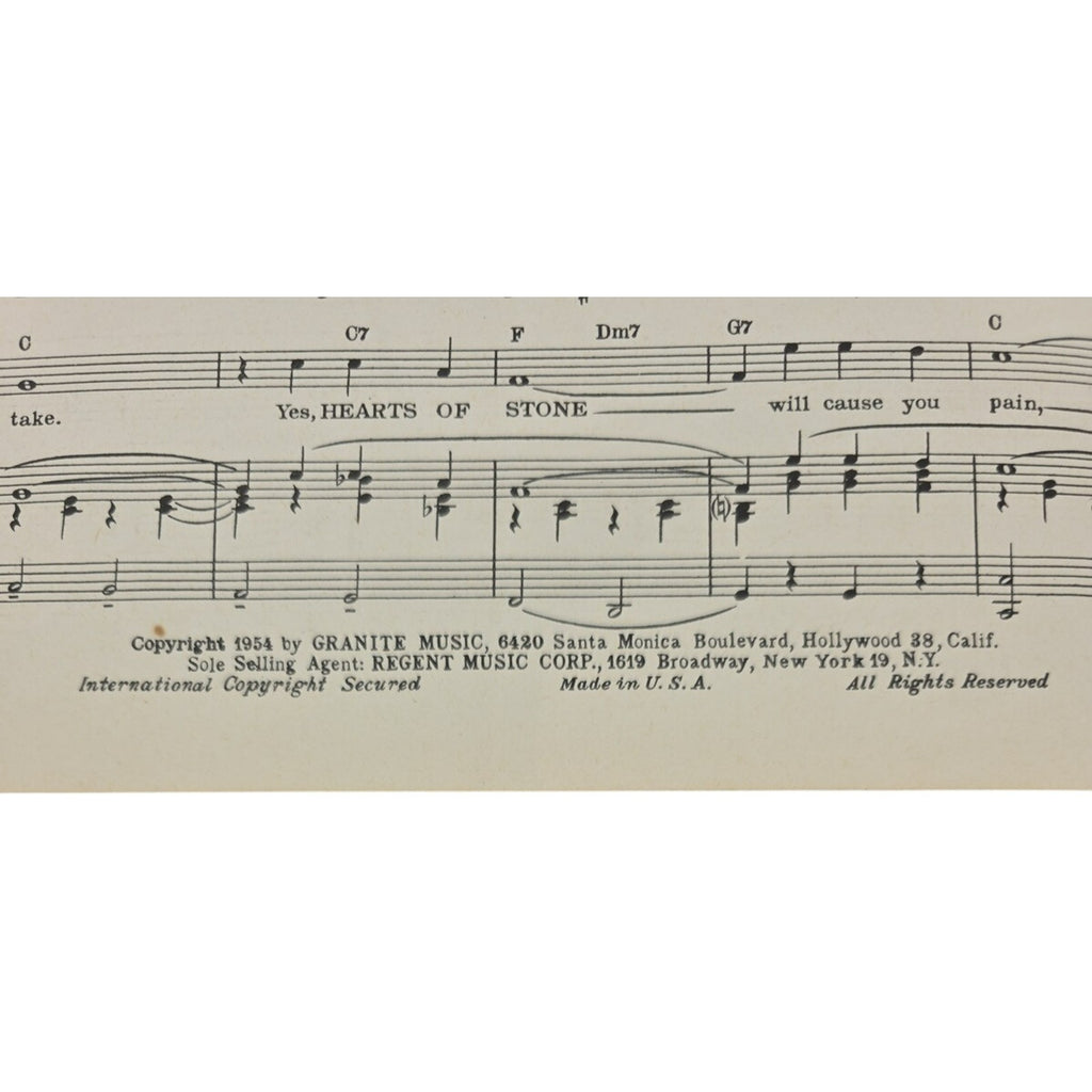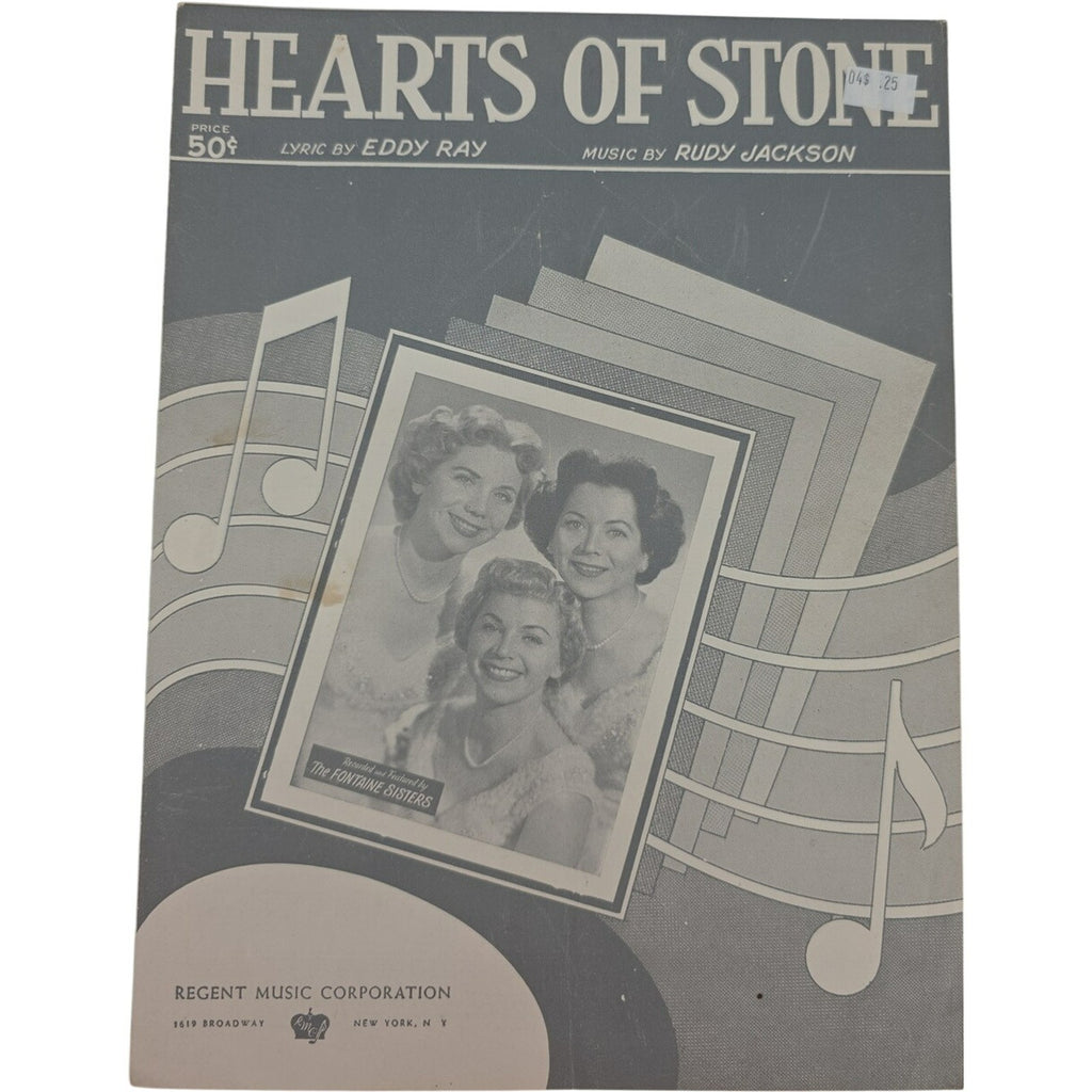 The product is a vintage sheet music from 1954 titled "Hearts Of Stone" by The Fontaine Sisters. This sheet music is designed for piano players with an intermediate level of experience and falls under the genre of Musicals. It is published by REGENT MUSIC CORPORATION in the United States. This nostalgic piece allows musicians to play timeless tunes from the mid-20th century, making it a valuable addition to any music collection.