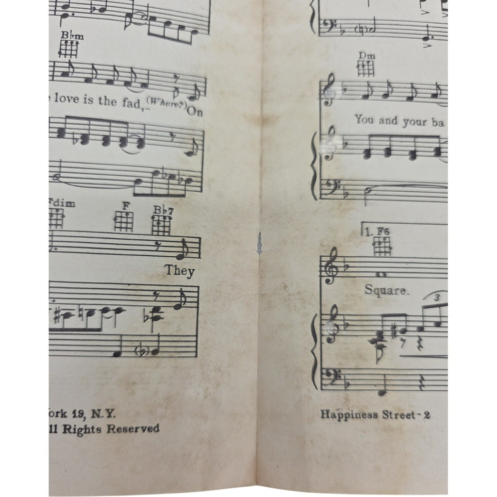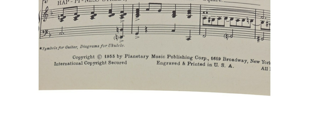 The product is a vintage sheet music titled "Happiness Street" from 1955 by Mack Wolfson and Edward R. White. It features songs in the genre of easy listening and musicals, suitable for acoustic guitar, piano, ukulele, and voice. Published by Planetary Music Publishing Corp. in the United States, this intermediate-level sheet music offers a nostalgic and classic musical experience for musicians and enthusiasts of vintage music.