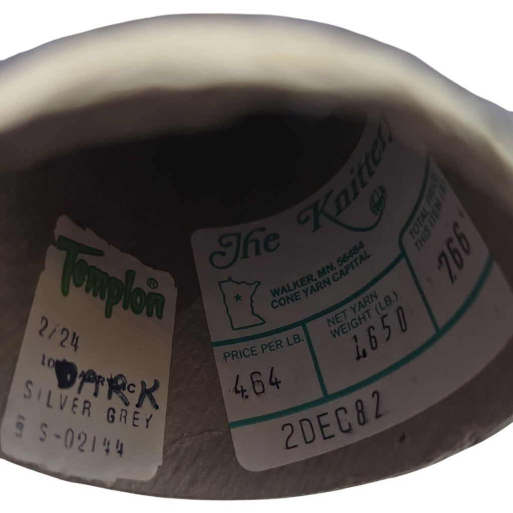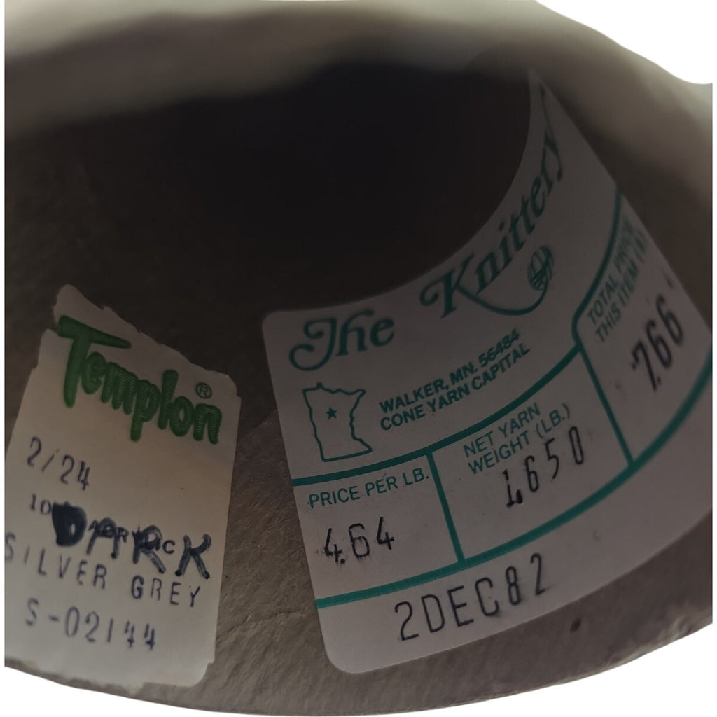 The Vintage Templon The Knittery Dark Silver Grey Acrylic Cone Yarn is a unique and rare find for crafting enthusiasts. Made in the United States, this lot of 2 vintage yarn cones is perfect for adding a touch of nostalgia to your projects. The dark silver grey color and acrylic fiber content make it versatile for a variety of crafts. Ideal for knitters and crocheters looking for a vintage touch to their creations.