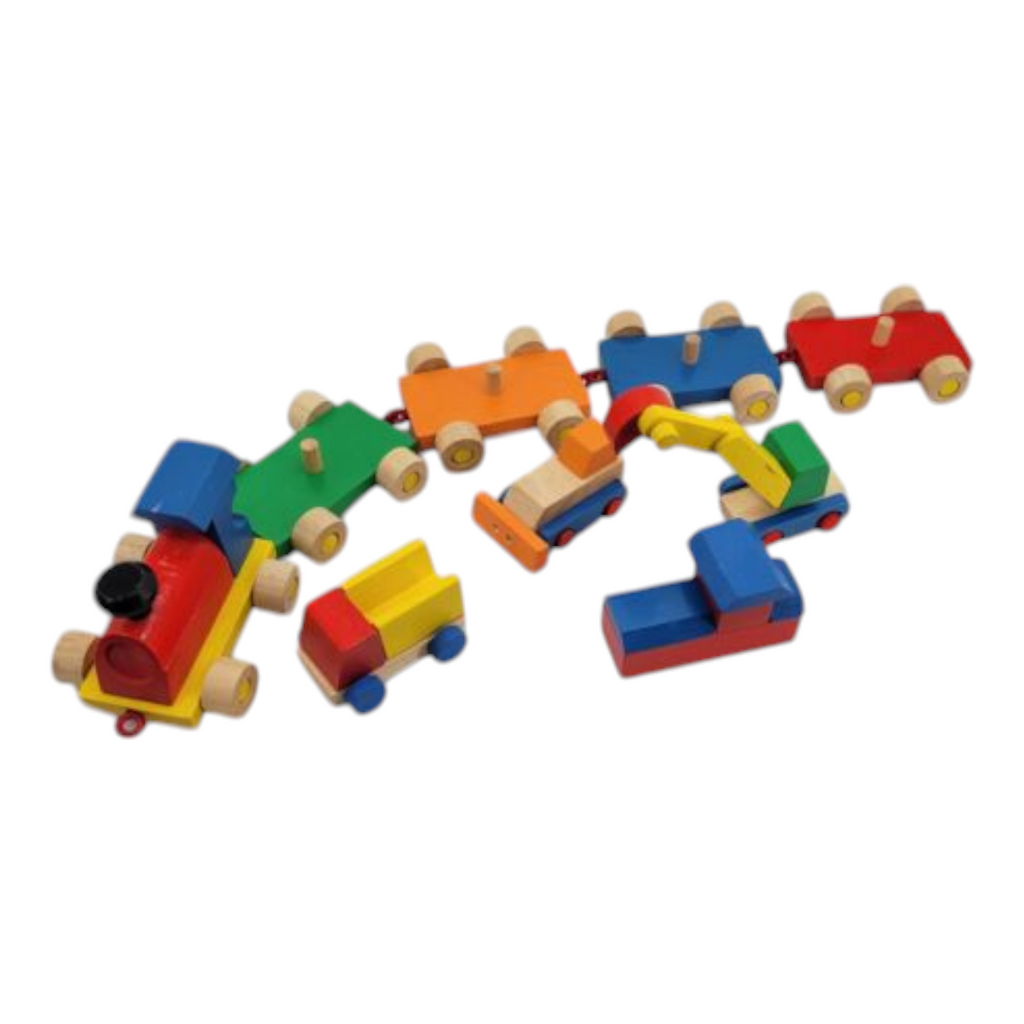 Vintage Toy Set: Includes a wooden train, crane, and dump truck.