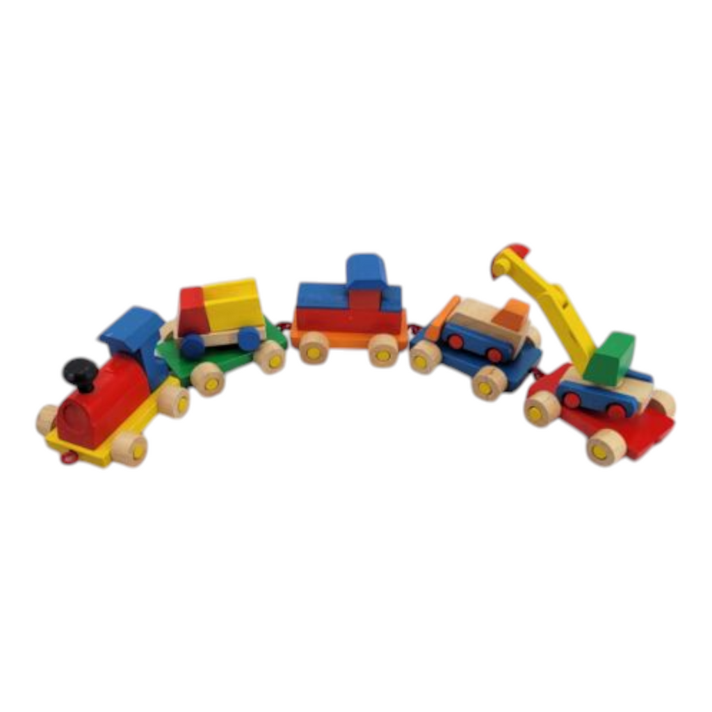 This vintage toy wooden train set features a colorful combination of blue, yellow, red, and green cars, complete with a wooden crane and dump truck. A charming piece that evokes nostalgia, this set is perfect for collectors or young children who love imaginative play. Although used, it remains in good condition with the classic, durable craftsmanship of vintage wooden toys.