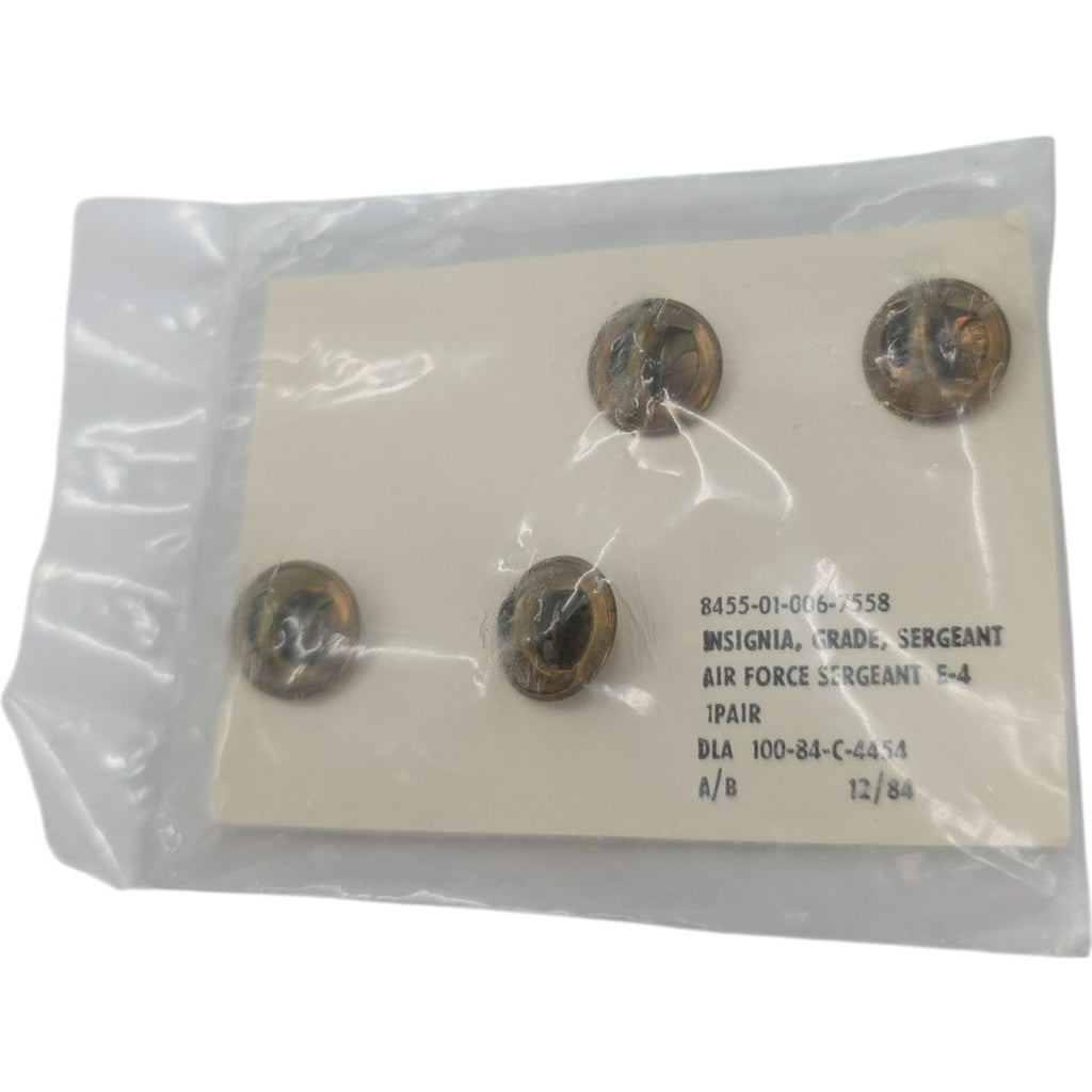 The product is a set of vintage United States Air Force collar pins, specifically designed for a US Air Force Buck Sergeant E4. These collectible pins were manufactured in 1996, making them a unique piece of militaria from the Air Force. Made in the United States, these pins showcase a retro design that represents the Air Force theme and history. Perfect for collectors or military enthusiasts looking to add a piece of vintage military memorabilia to their collection.