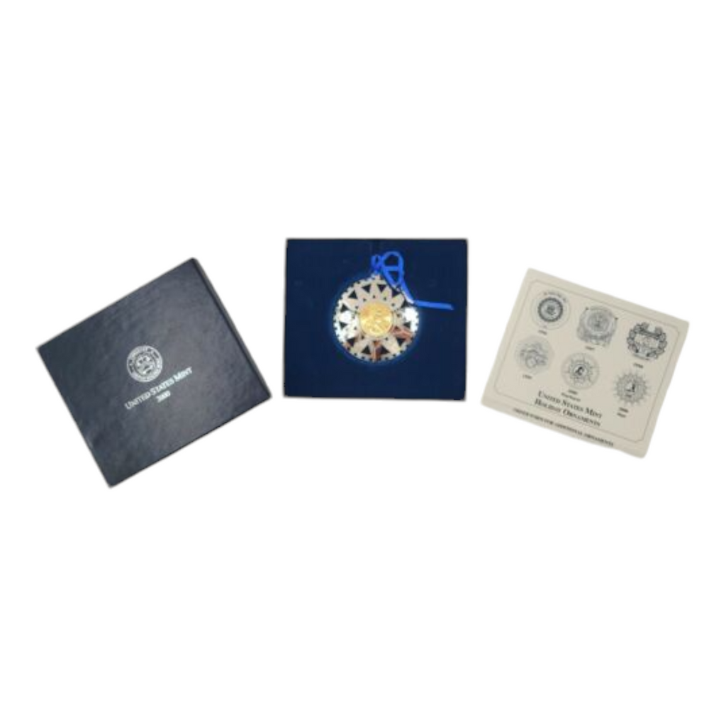 Celebrate the holidays with this exquisite Vintage United States Mint 2000 Holiday Ornament. This collectible piece is a stunning addition to any holiday decor, featuring intricate details and a timeless design that commemorates the year 2000. In very good condition, this ornament comes complete with its original box and description pamphlet, making it perfect for collectors or as a thoughtful gift.