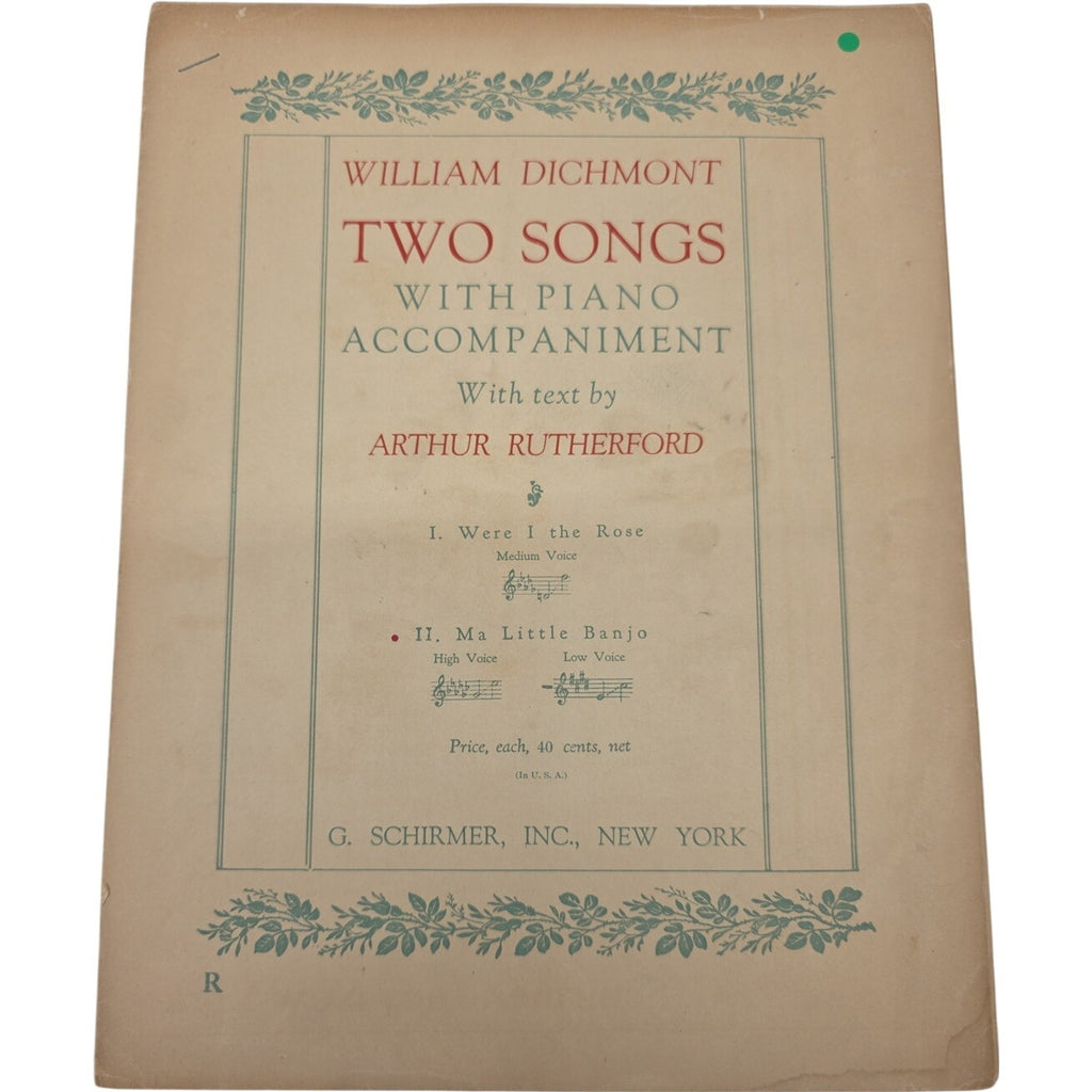 The product is a vintage sheet music from 1917 titled "Two Songs with Piano Accompaniment" by William Dichmont. Published by G. Schirmer, Inc in the United States, this sheet music is specifically designed for piano accompaniment. As a unit that contains one sheet of music, this item is a valuable collectible for musicians or music enthusiasts interested in classic pieces from the early 20th century.
