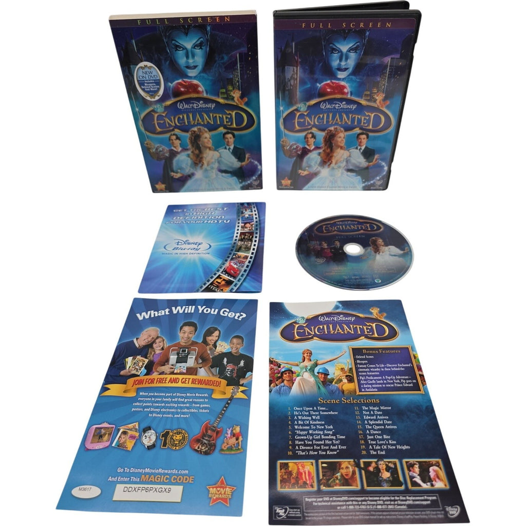 The product is a DVD of Walt Disney's "Enchanted" in full screen edition, featuring bonus features and inserts. Directed by Barry Josephson and Barry Sonnenfeld, this PG-rated film falls under the genres of family and Disney, with a run time of 107 minutes. Produced by Walt Disney Video in the United States, the DVD includes a variety of special features and content related to the contemporary comedy aspect of the story. Perfect for fans of classic Disney movies and those looking for additional content beyond the film itself.