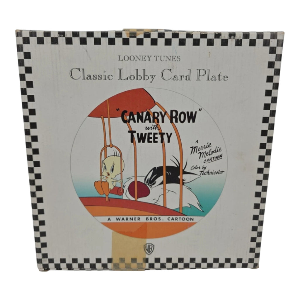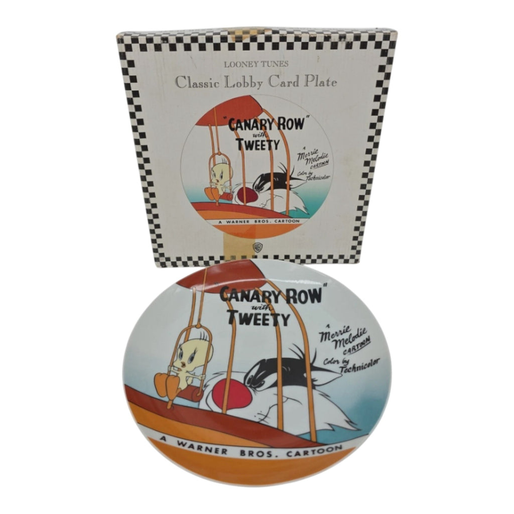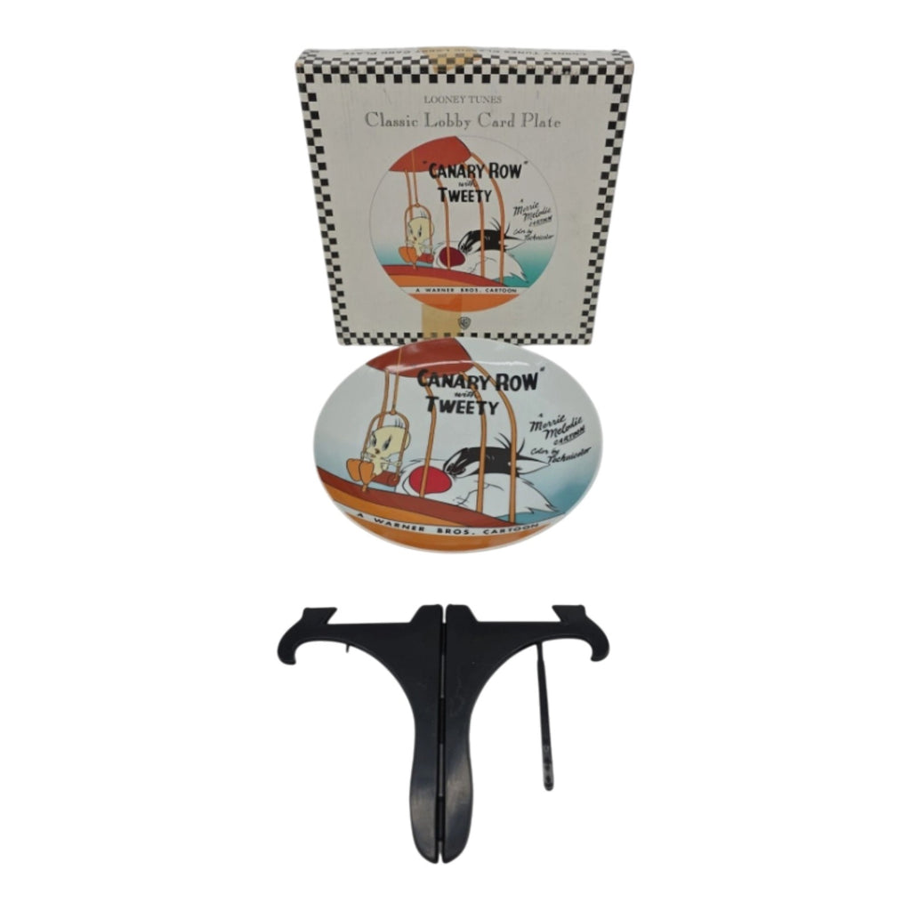 The Warner Bros Looney Tunes Tweety Canary Row Classic Lobby Card Plate with Stand is a round collector plate featuring colorful images from the iconic Warner Bros cartoons. This decorative piece showcases beloved characters like Bugs Bunny, Daffy Duck, Tweety, and more, making it a must-have for collectors of classic animation memorabilia. The multicolor design adds a fun and whimsical touch to any space, while the stand allows for easy display on a shelf or desk. Perfect for fans of Warner Bros and animated classics.