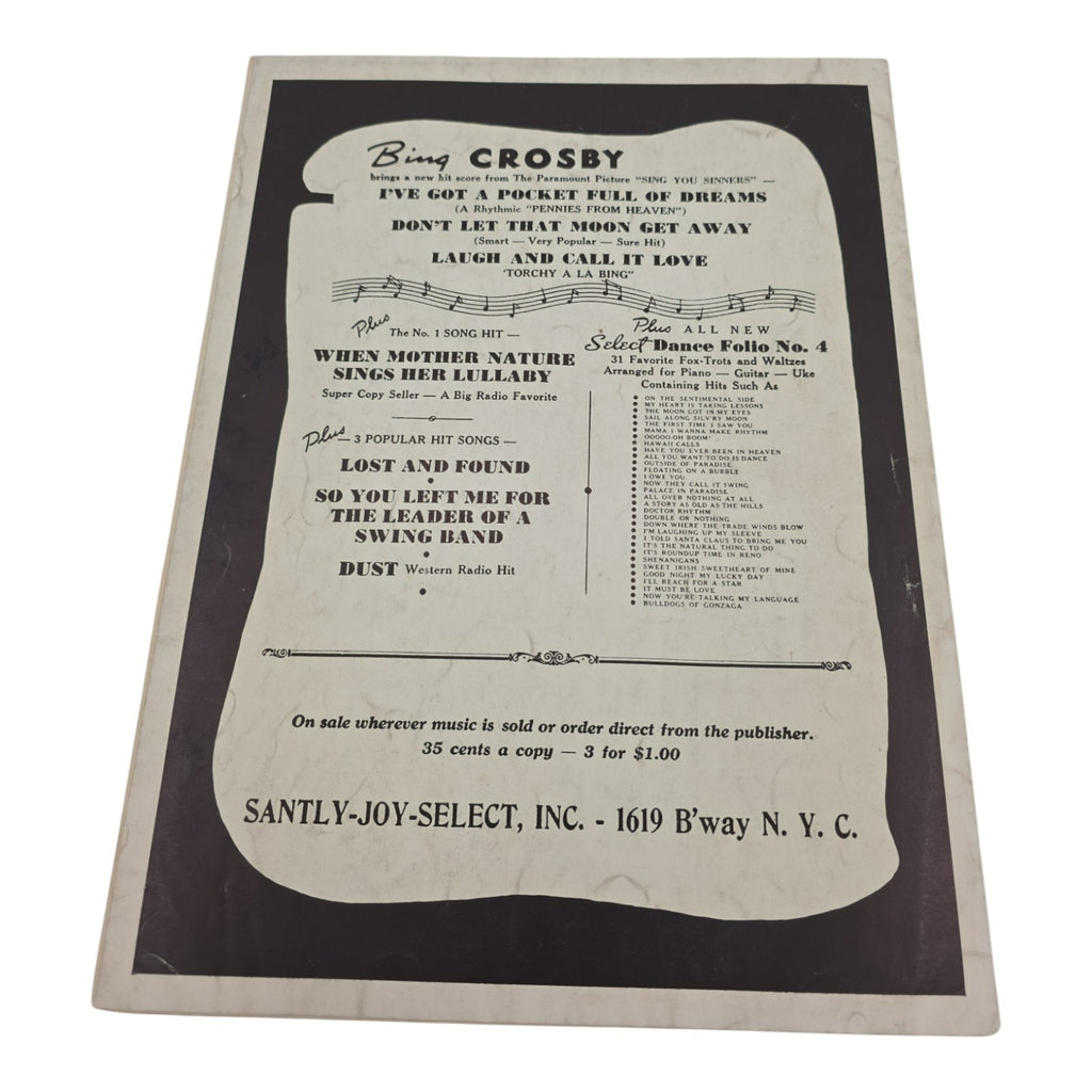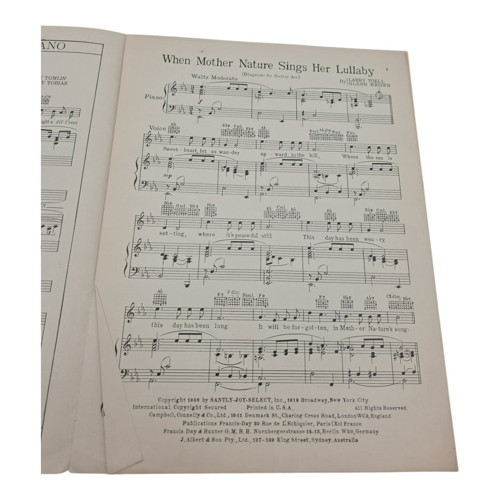 The product is a vintage sheet music titled "When Mother Nature Sings Her Lullaby" by Larry Yoell and Glenn Brown. This piano music falls under the genre of Musicals and is published by Santly-Joy-Select Inc. in the United States. It is designed for intermediate level piano players and comes as a single unit. This sheet music offers musicians the opportunity to play a soothing and beautifully composed lullaby that pays homage to the beauty of nature.