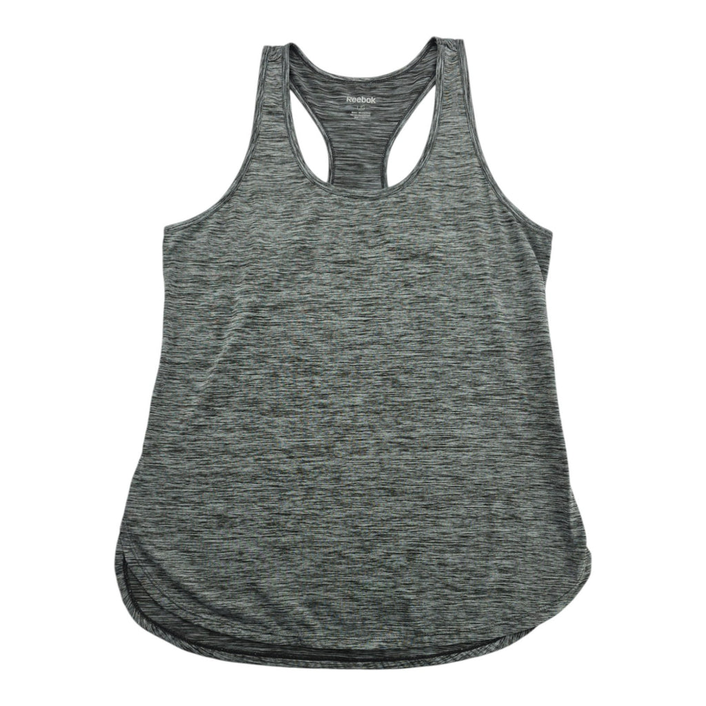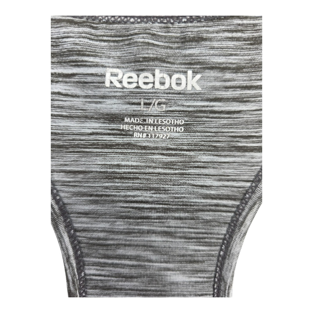 This Women's Reebok Gray Black Athletic Tank Top Tee in size L is a versatile piece of activewear suitable for running and jogging. The sleeveless design with a round neckline and racerback strap type provides comfort and support during workouts. Made from a blended fabric with a medium wash, this pullover tank is machine washable and easy to care for. The solid gray color with athletic fit makes it a perfect choice for active women looking for a basic yet stylish blouse.