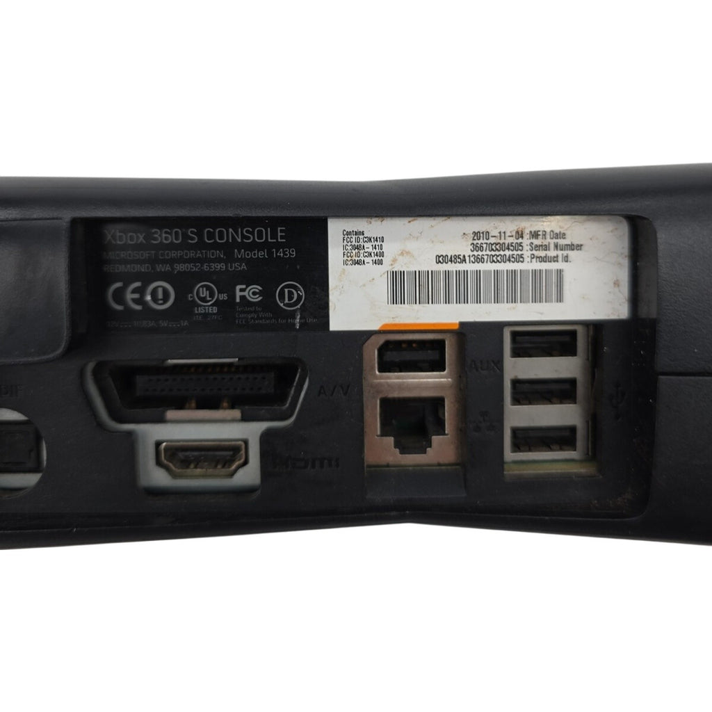 The Xbox 360 S Slim Black Model 1439 4GB is a tested and working console from Microsoft, featuring a sleek black design. This home console offers various connectivity options including Component RCA and HDMI, along with Blu-Ray compatibility and Wi-Fi capability. With a storage capacity of 4GB, this unit is perfect for gaming and entertainment purposes, making it a great addition to any entertainment setup.